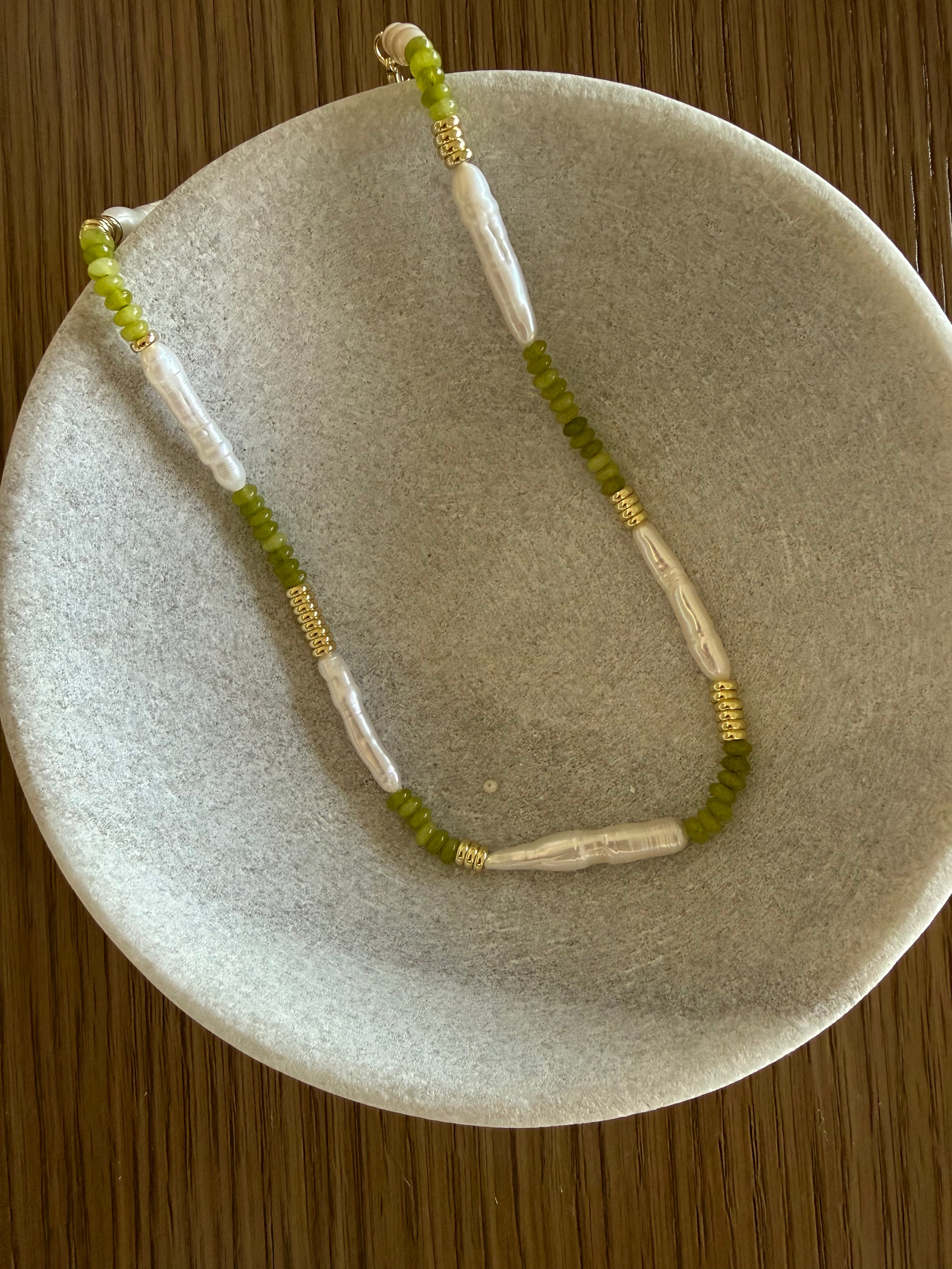 Green Gemstone and natural Pearl Necklace with Gold Plated Beads.
