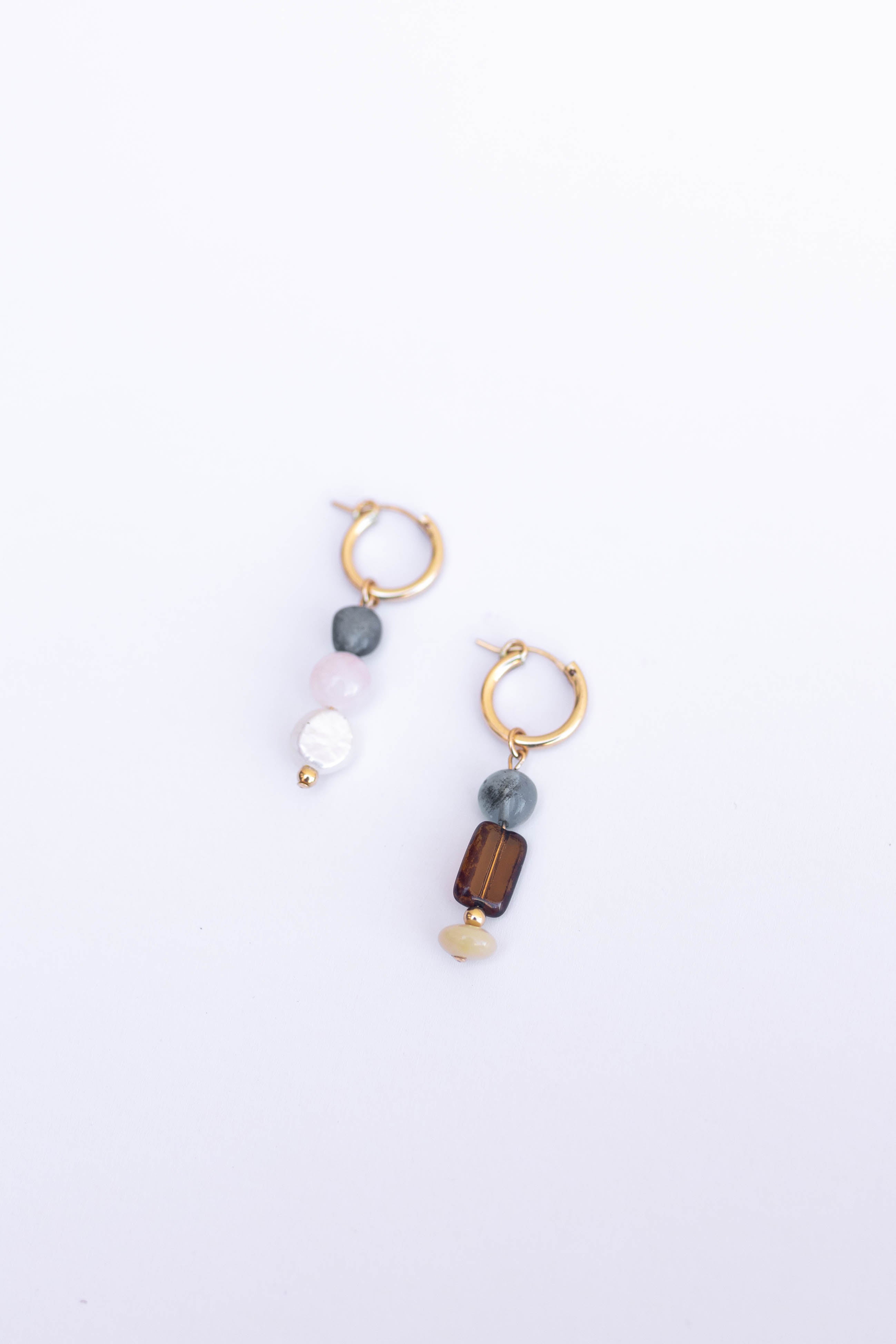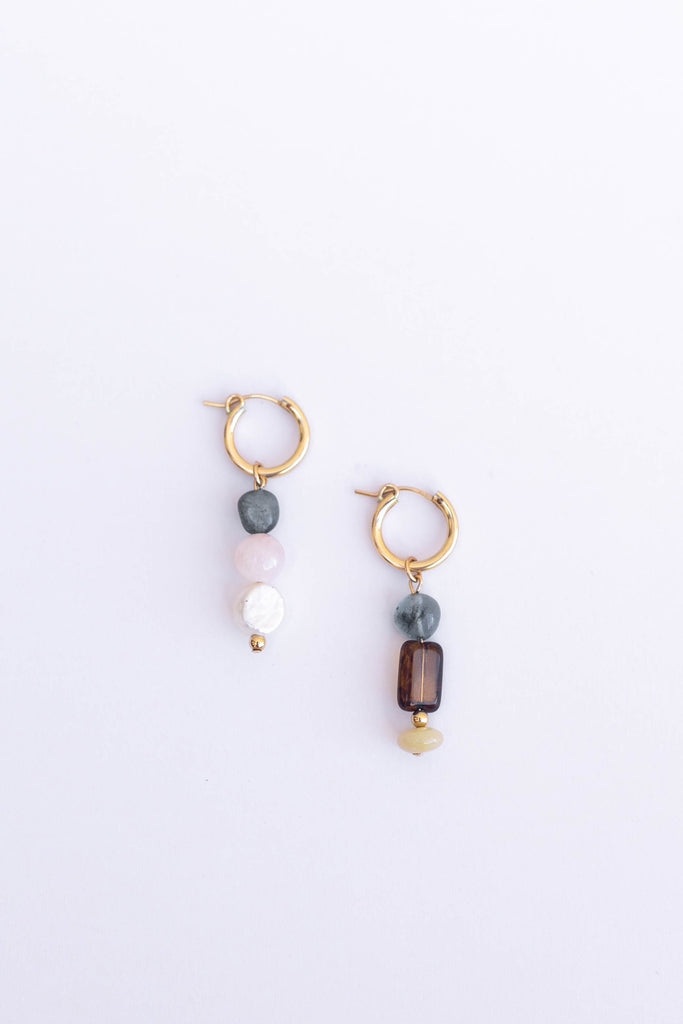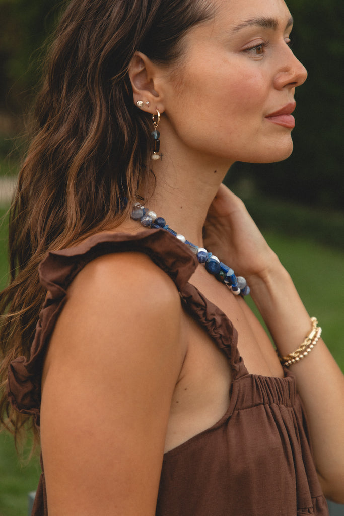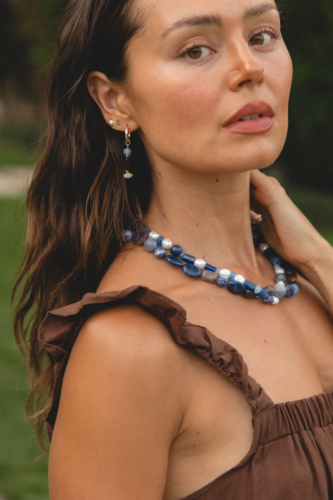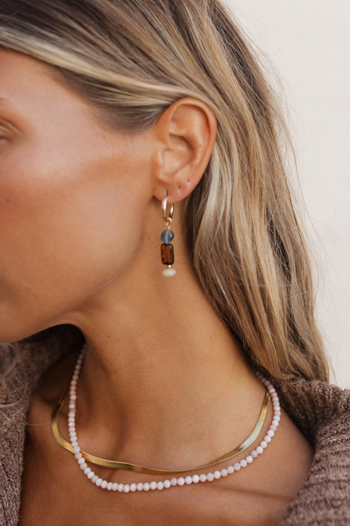 Soft light meets rich color in the Dusklight Drops. These beaded drop earrings feature a moody mix of brown, inky blue, and luminous pearl beads—echoing the gentle glow of evening’s last light. Elegant yet easy to wear, they bring a subtle shimmer and warmth to every look in the Dusk Collection.