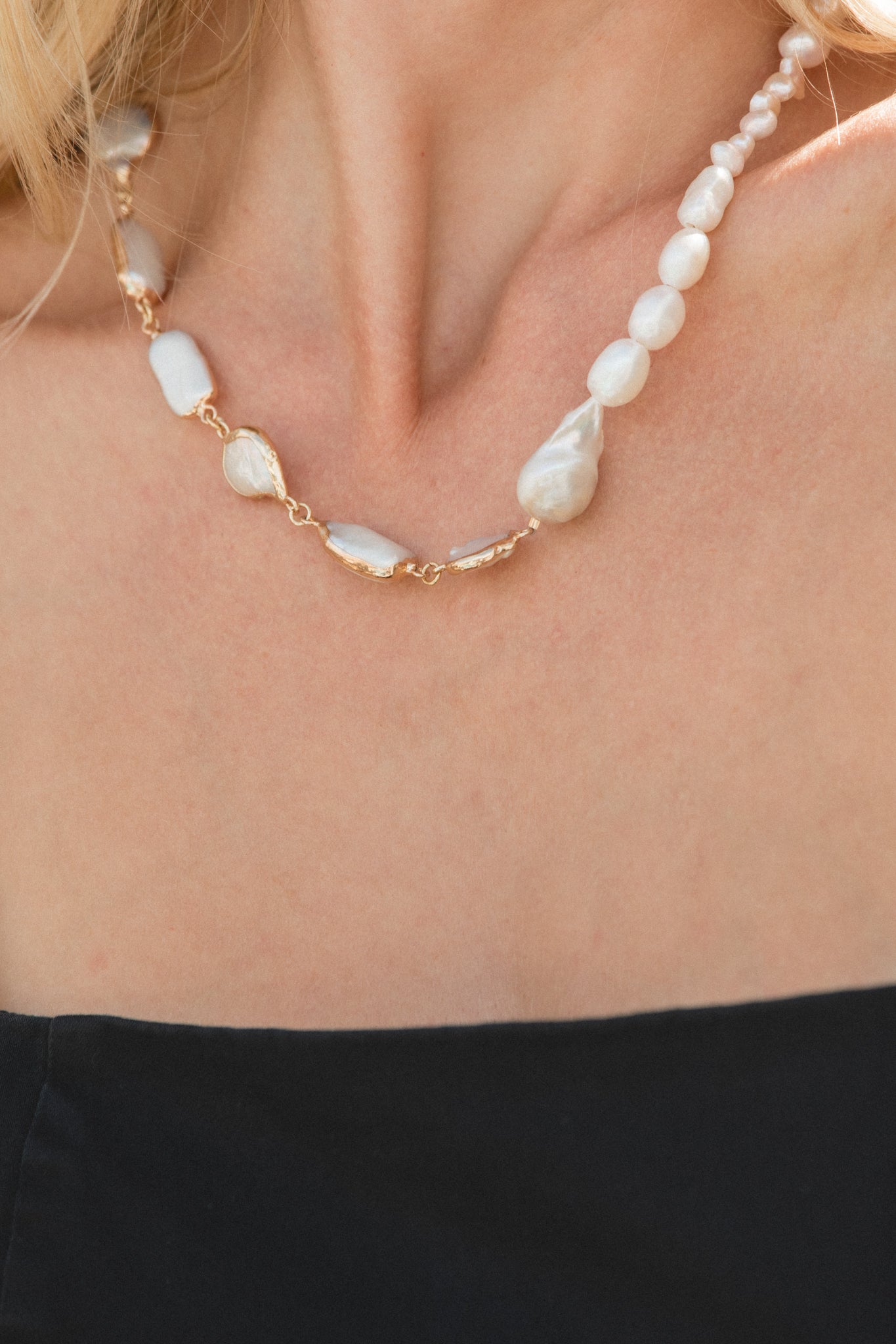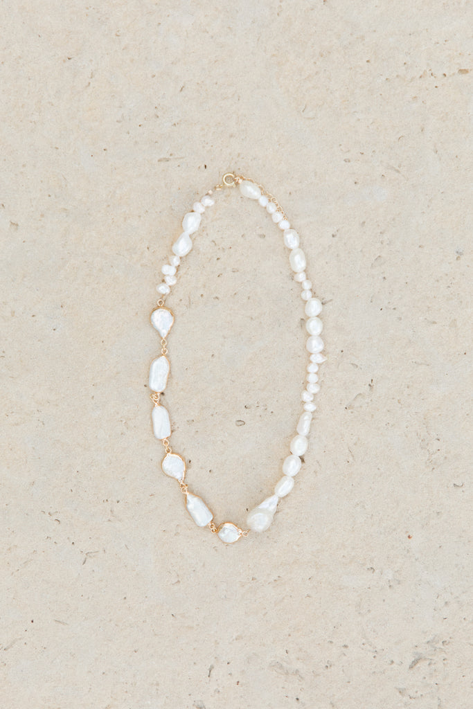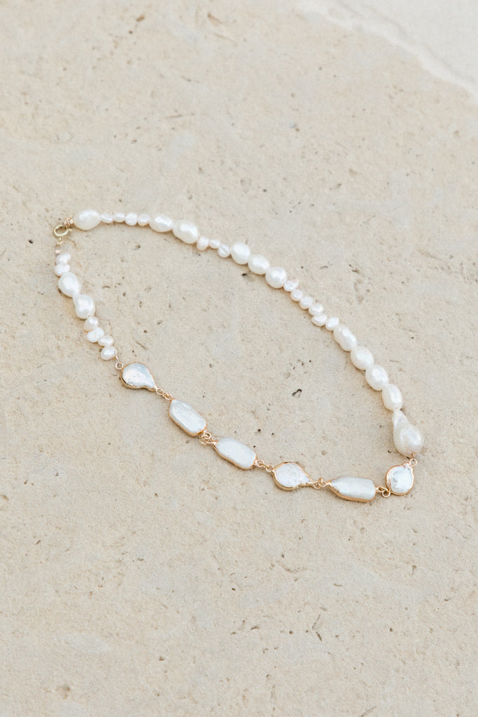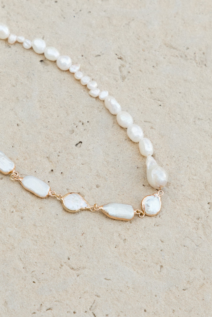 A striking play of contrast and form, the Eclipse Pearl Necklace reimagines the classic pearl strand. Freshwater pearls meet mismatched beaded strands, creating an artful asymmetry that mirrors the beauty of an eclipse. One side features a bezeled pearl strand that catches the light with subtle brilliance—an elevated piece from the Dusk Collection that feels both timeless and unexpected.