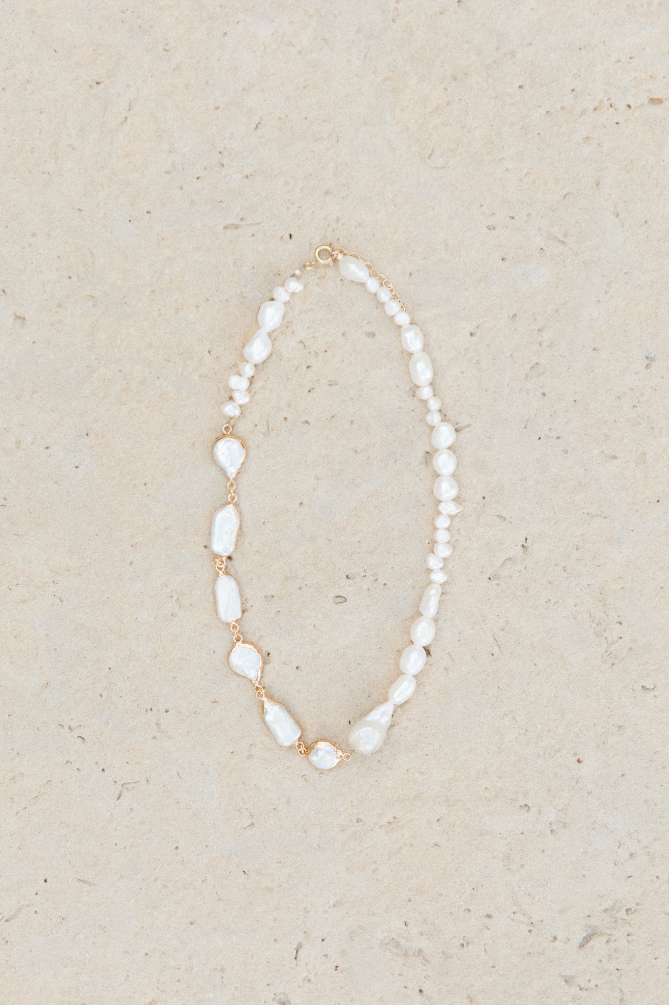 Made from 14k gold-filled material and mismatched freshwater pearls