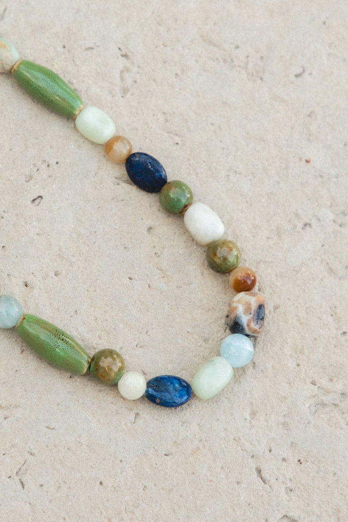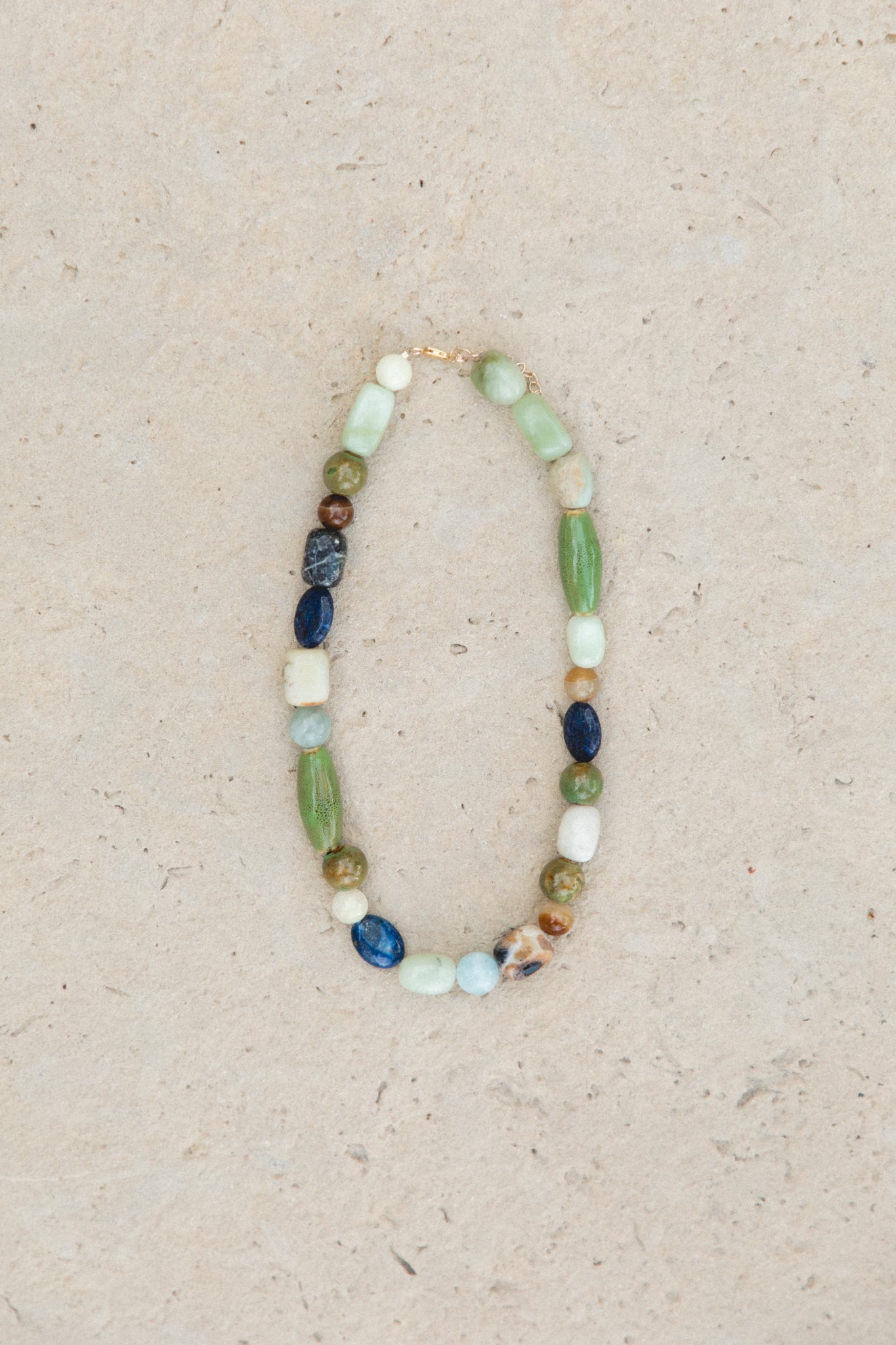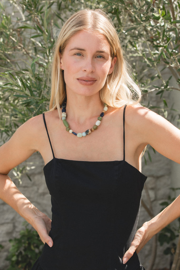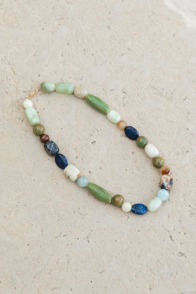 Earthy and enchanting, the Mossy Oak Necklace captures the hues of nature at dusk. Made from a mix of mismatched green, blue, and brown beads, each strand feels organic and one-of-a-kind—like sunlight fading through forest leaves. A statement piece from the Dusk Collection that pairs the beauty of the outdoors with an effortlessly elevated edge.