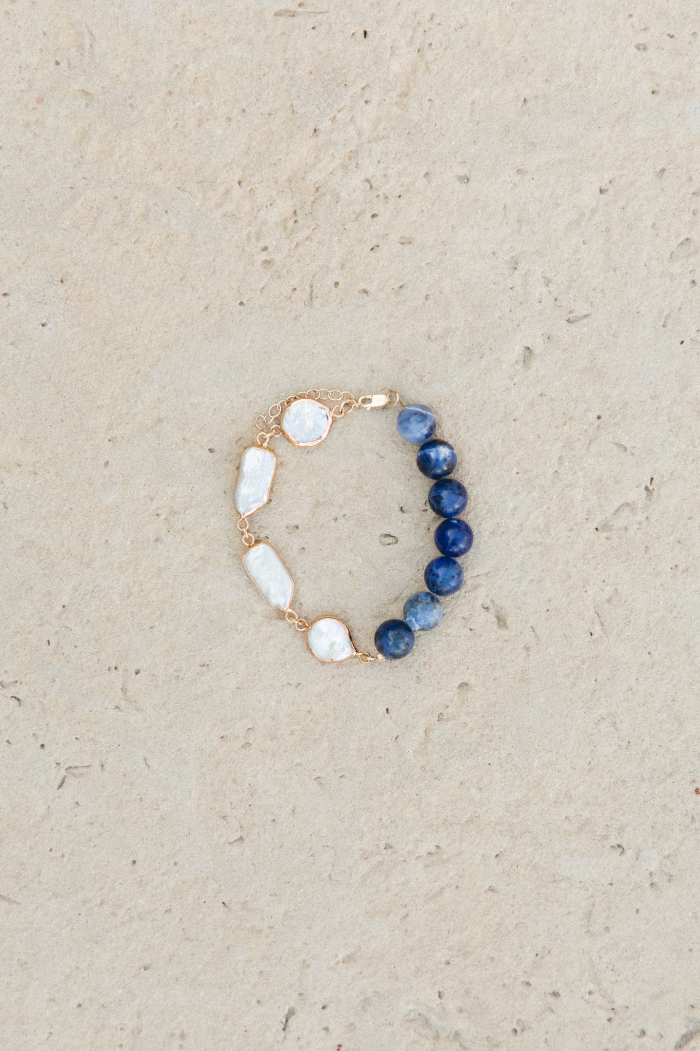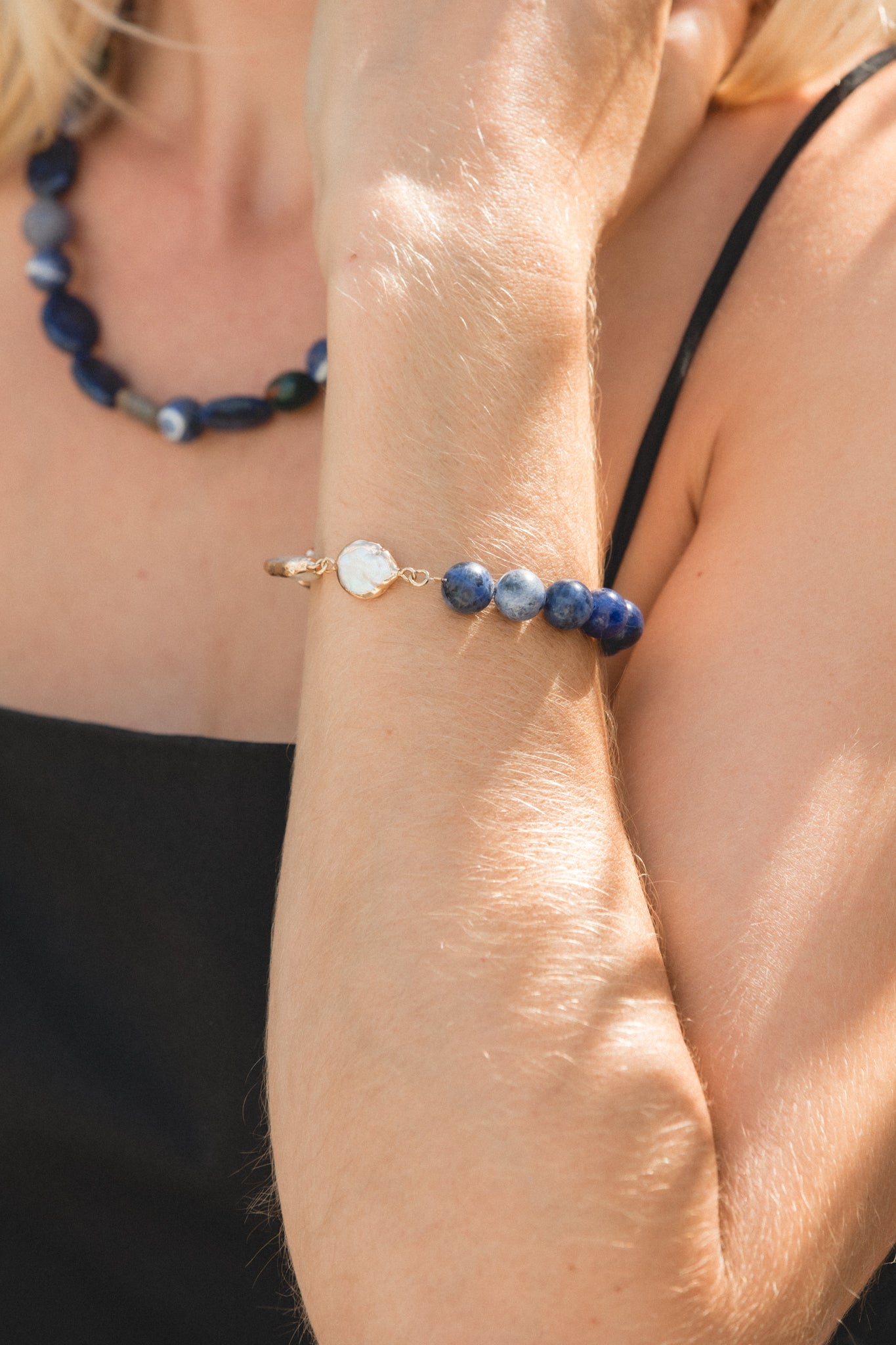 A twilight twist on a classic, the Nightfall Pearl Bracelet pairs beveled freshwater pearls with deep blue beads for a look that’s both luminous and grounded. Each detail reflects the quiet elegance of nightfall—soft light, deep color, and effortless sophistication. A perfect companion to the Nightfall Pearl Necklace or a standout piece on its own from the Dusk Collection.