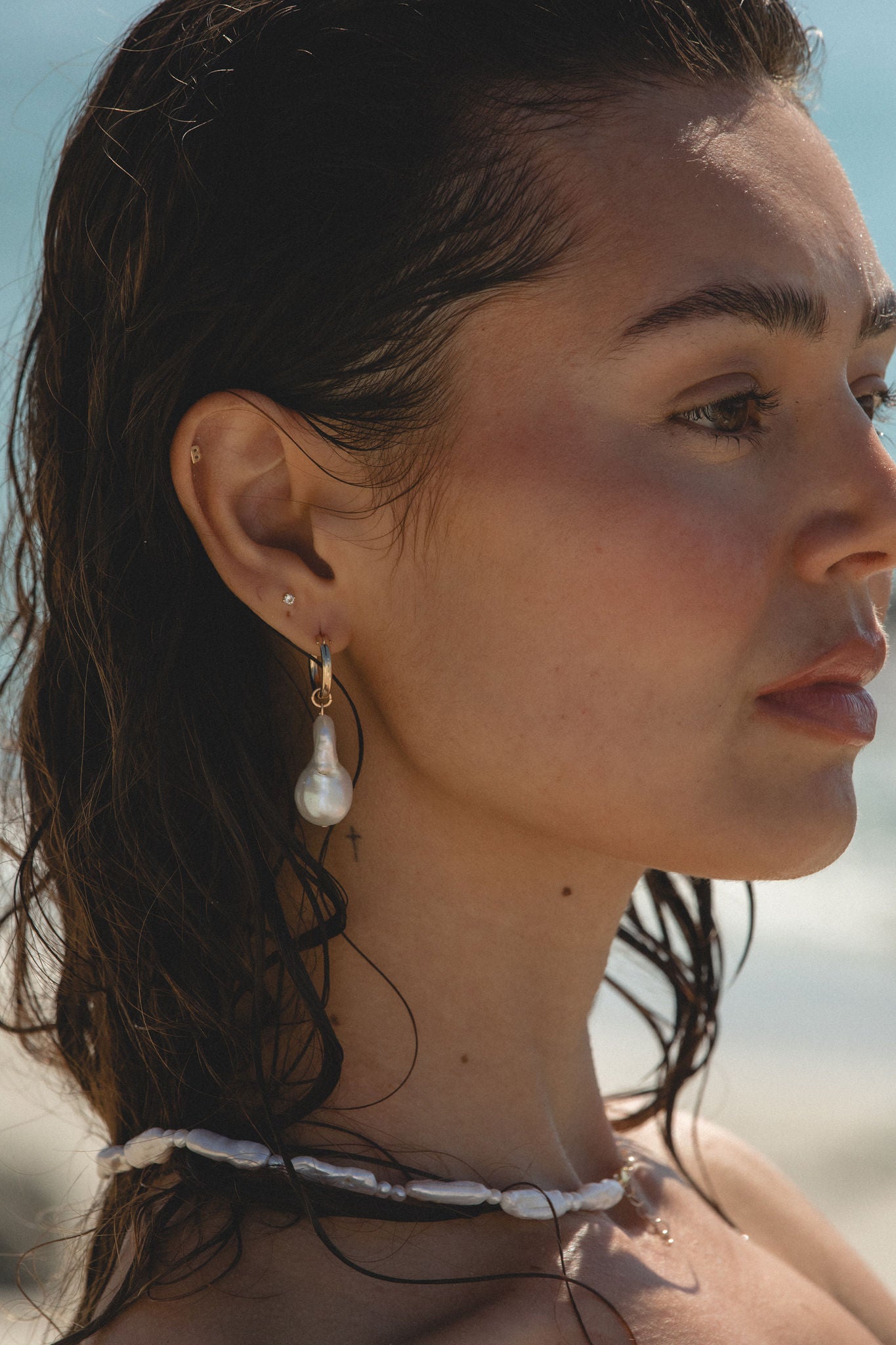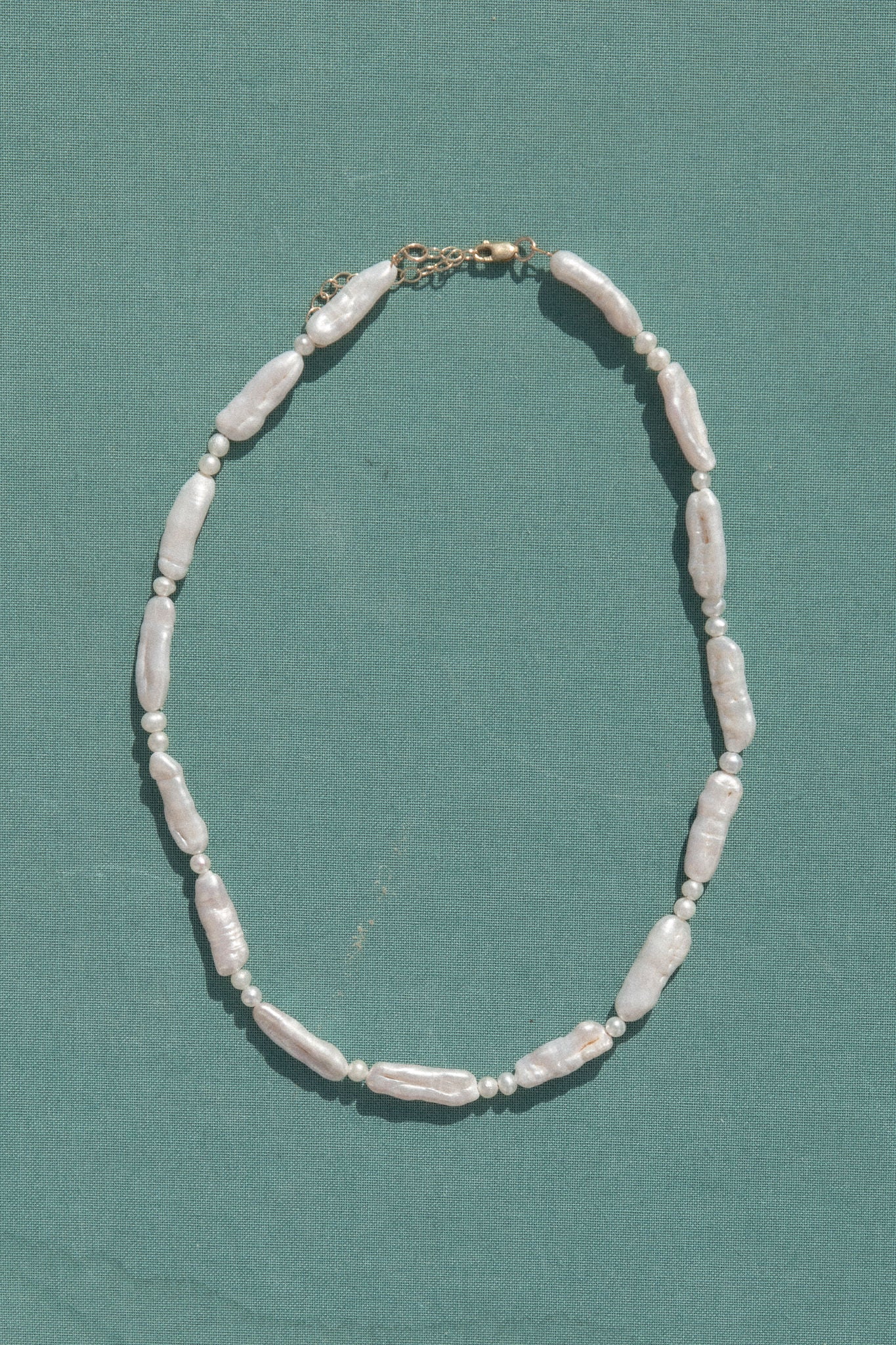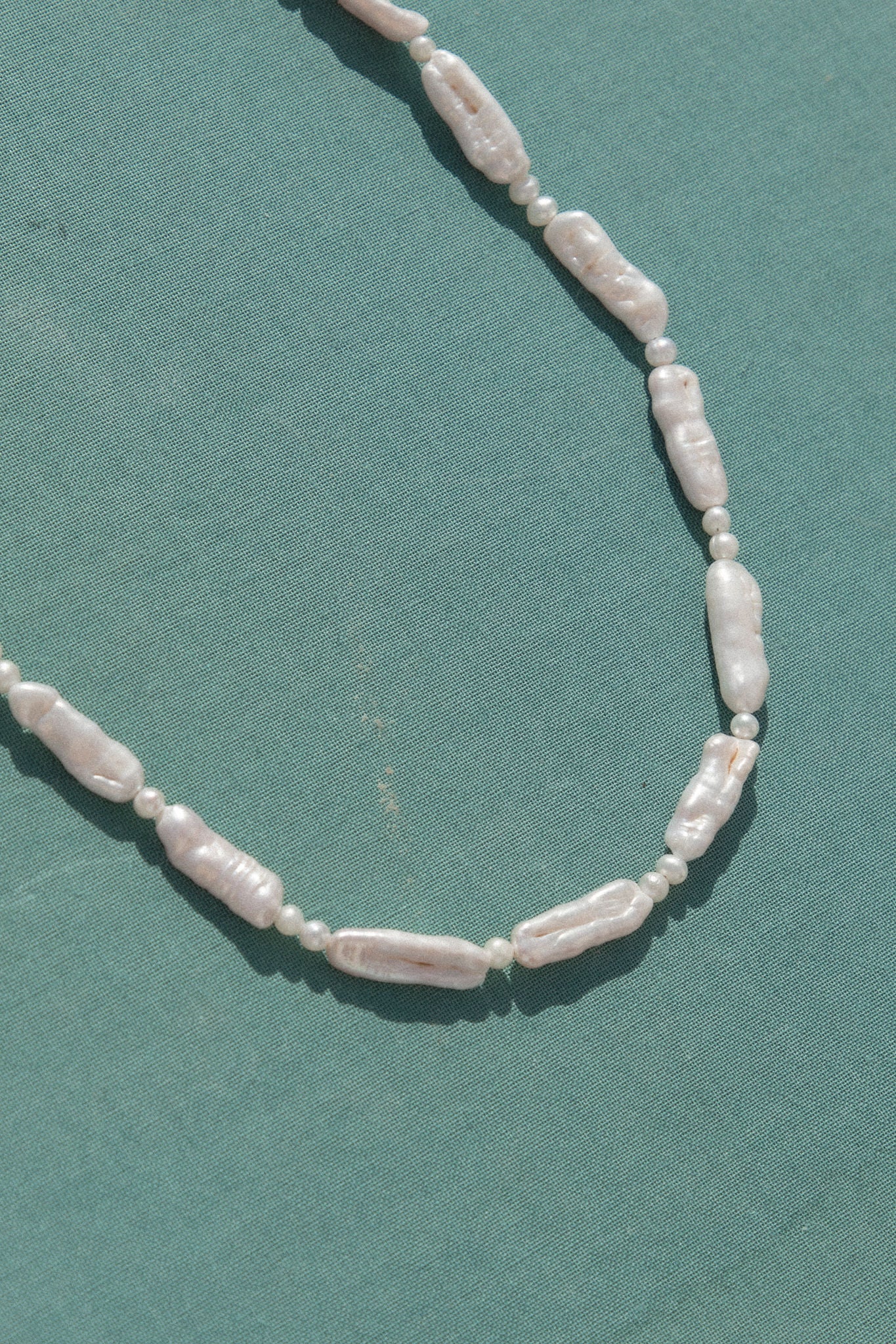 A strand of elongated freshwater pearls spaced with small organic pearls for natural texture and movement. Each pearl varies slightly in shape, giving this piece an easy, coastal feel.