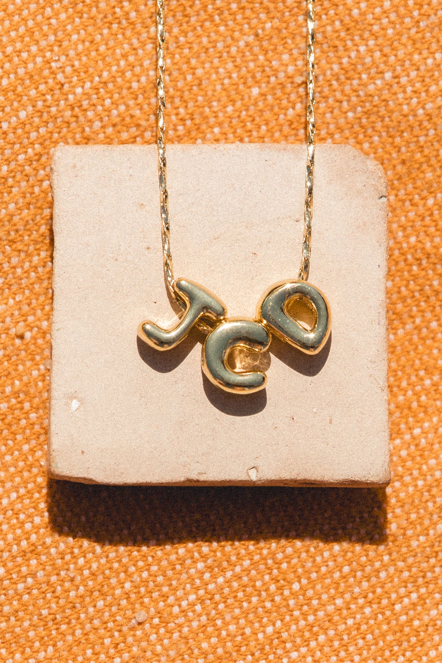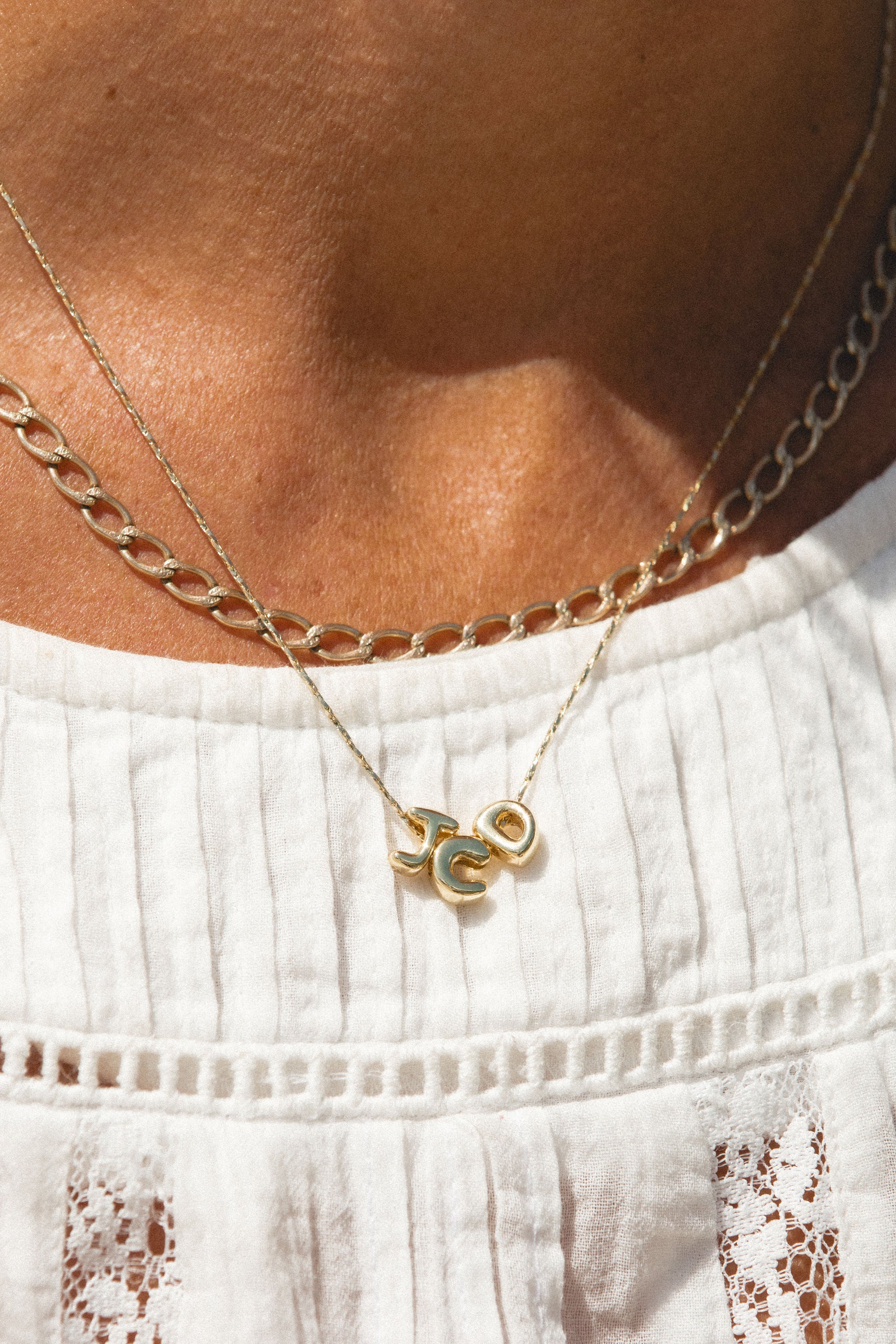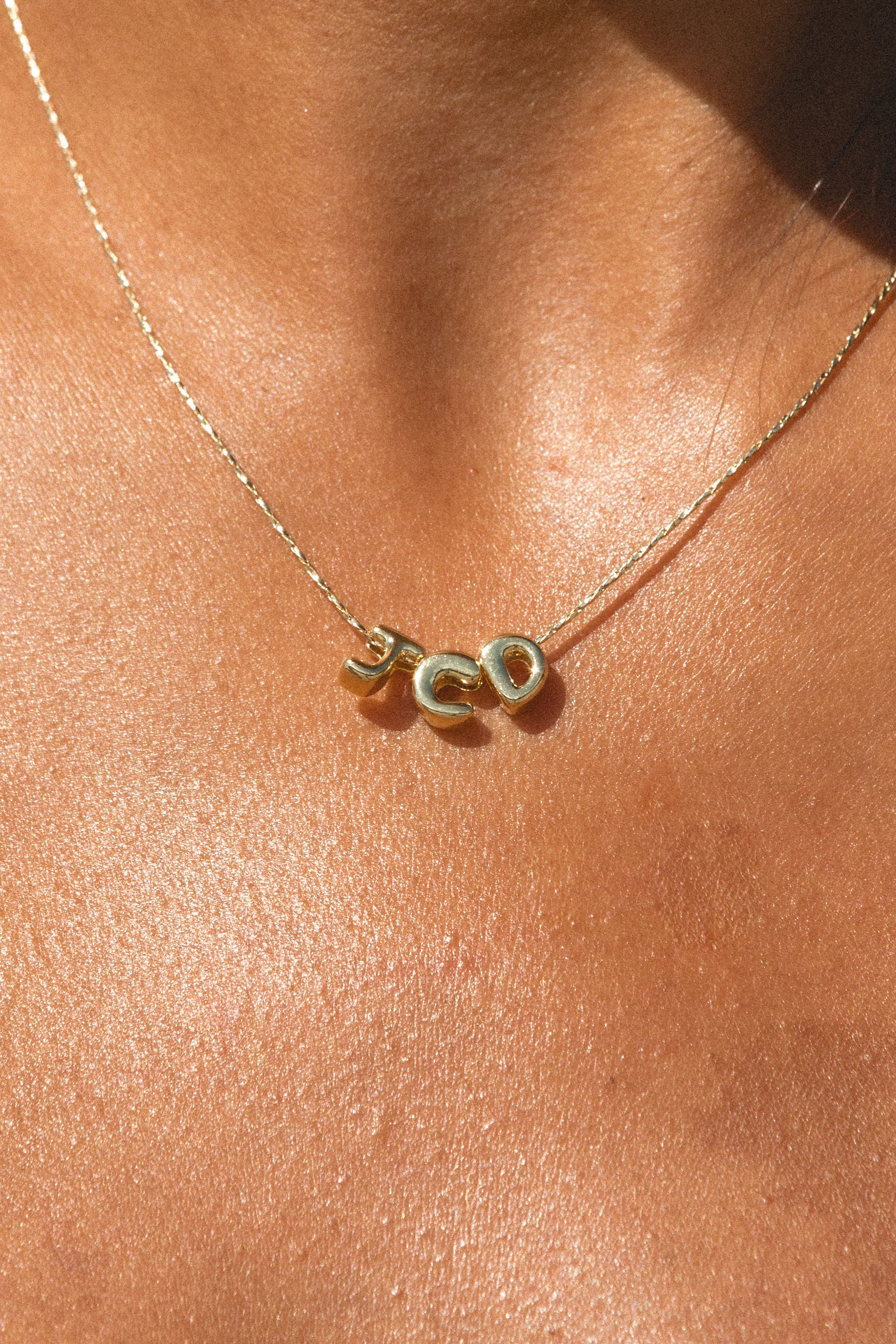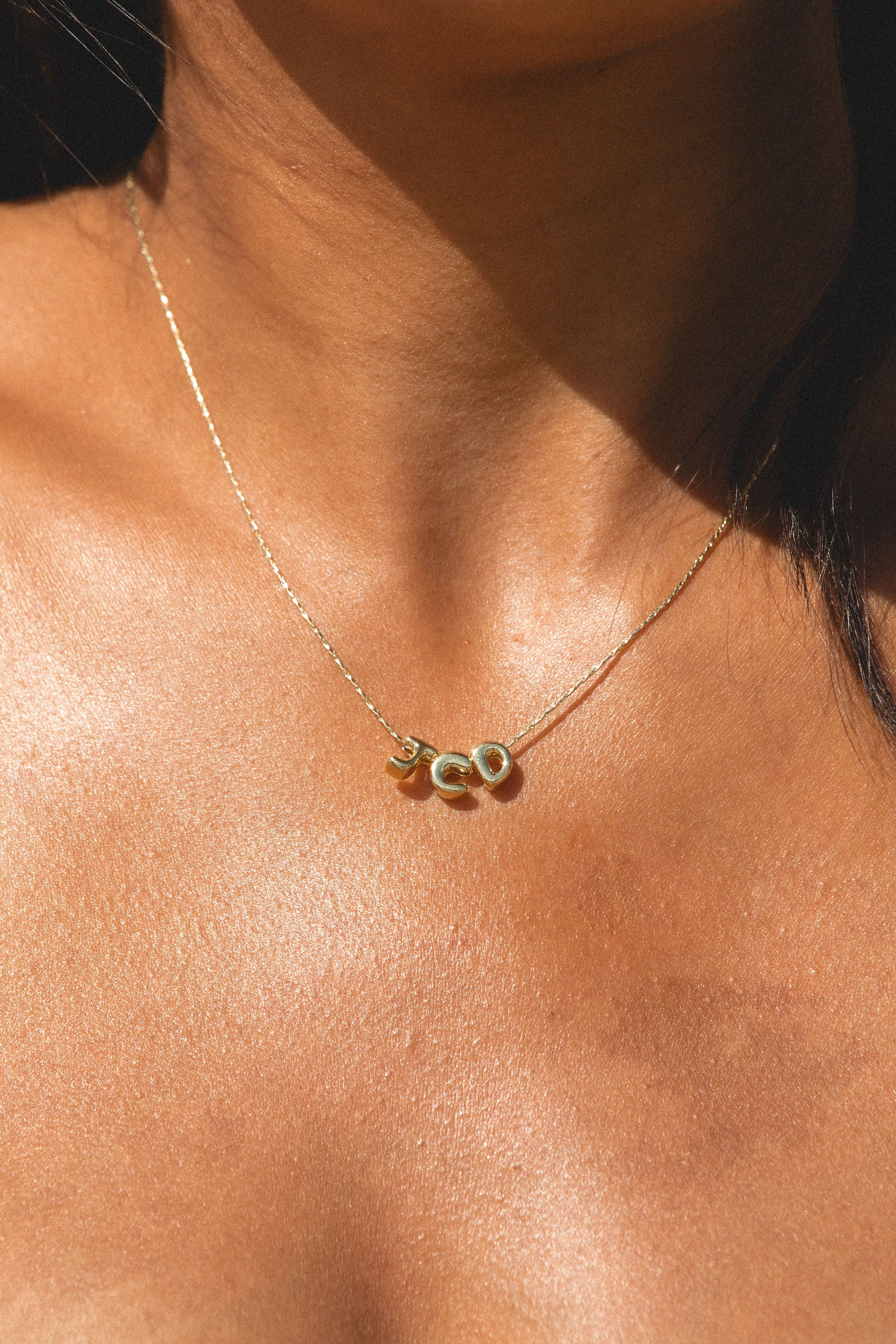 Delicate bubble initials float gracefully along a fine gold chain, creating an effortless personalized touch. Choose up to five initials to customize your necklace—perfect for layering or wearing solo. This dainty piece celebrates the people and moments that matter most, combining timeless elegance with meaningful personalization. A versatile staple that transitions seamlessly from everyday wear to special occasions.
