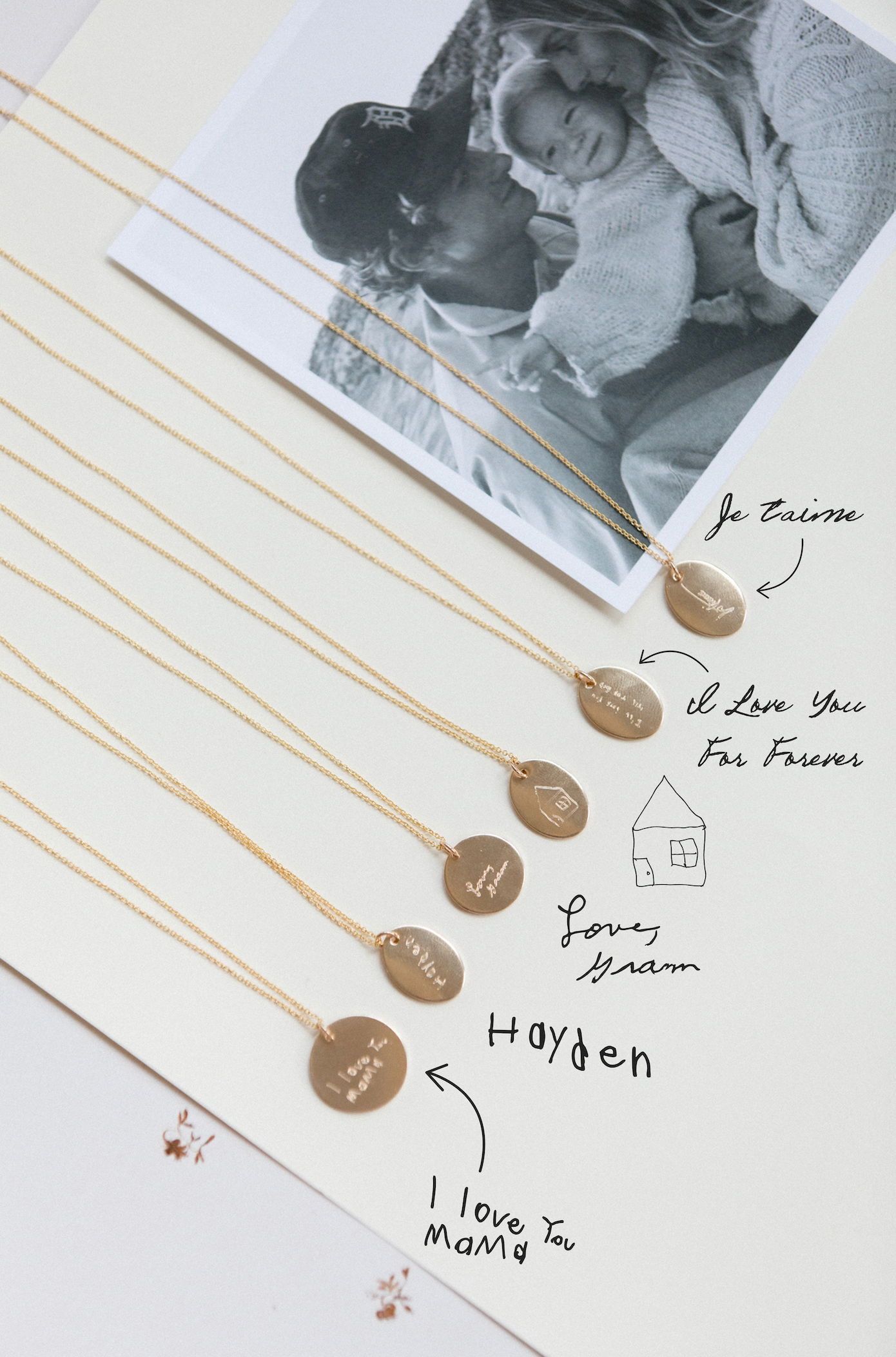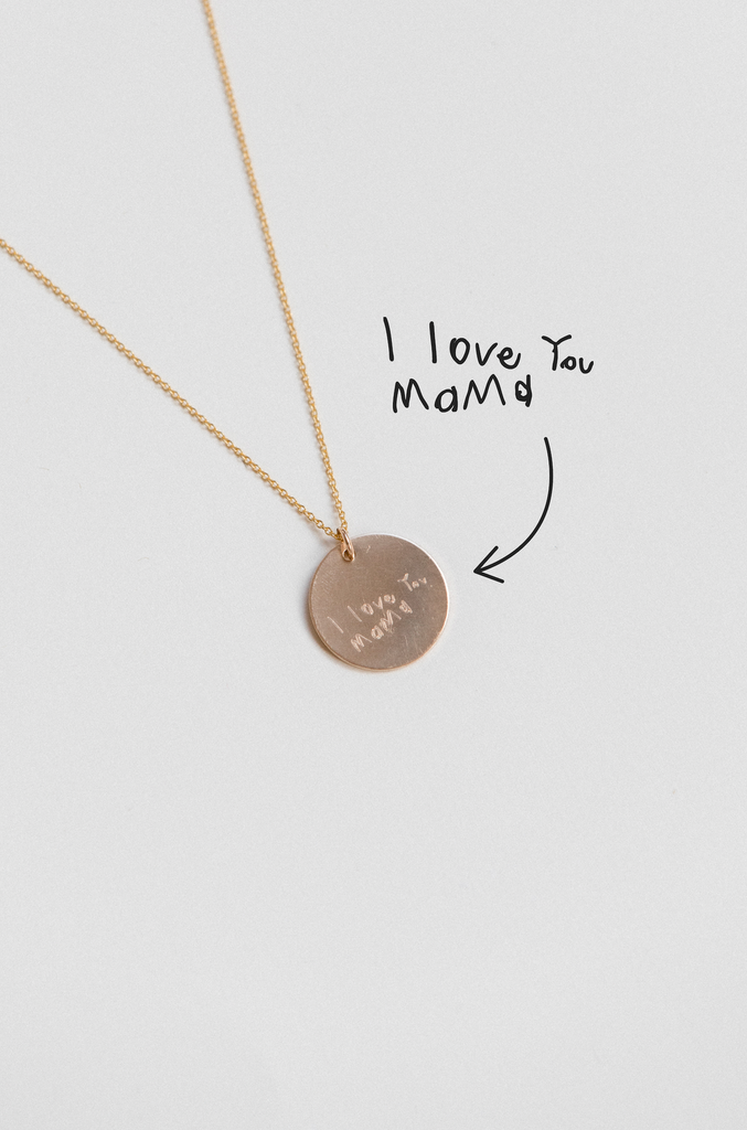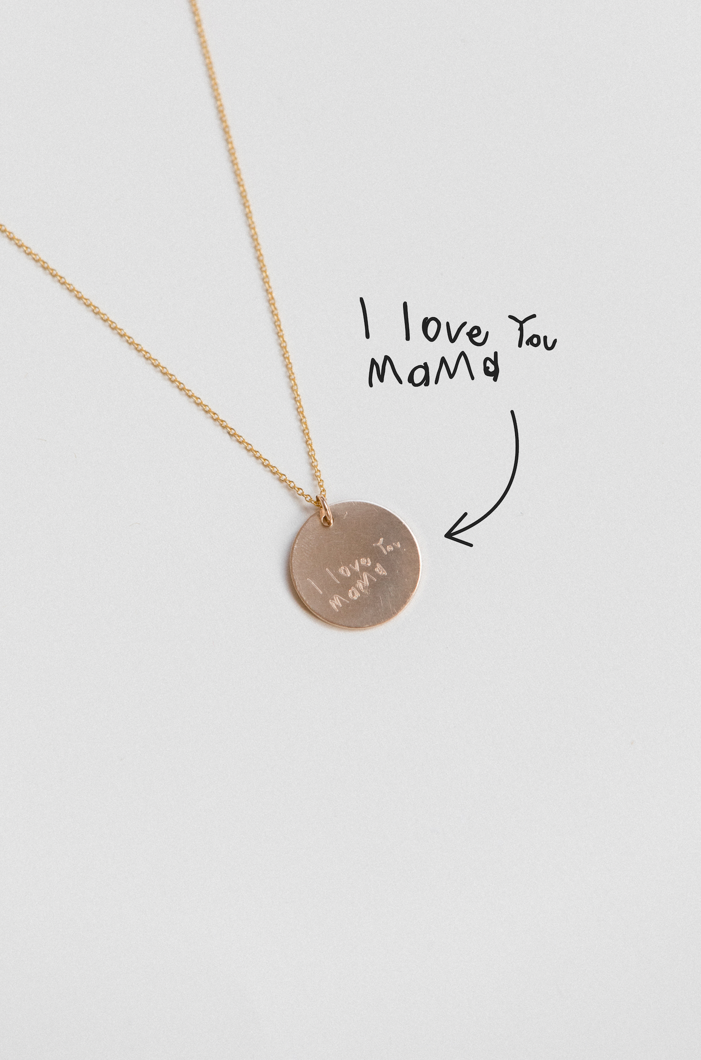Capture a cherished message in a timeless piece with the Engraved Handwriting Disc Necklace. Expertly crafted to preserve the unique script of you or a loved one, this elegant pendant transforms a heartfelt note into wearable art. Its refined design complements any style, making it a sophisticated keepsake that celebrates personal connection and lasting sentiment.