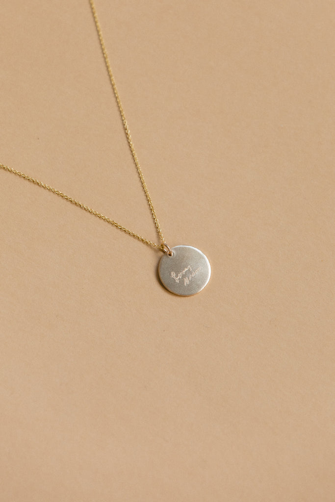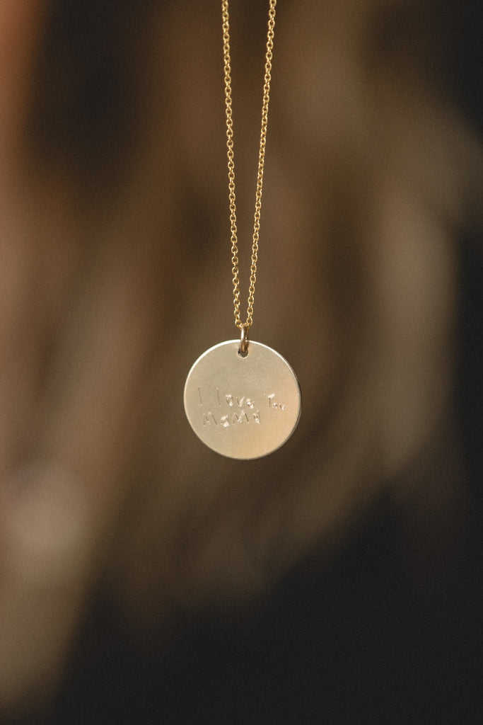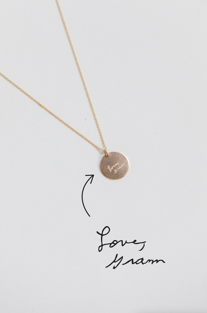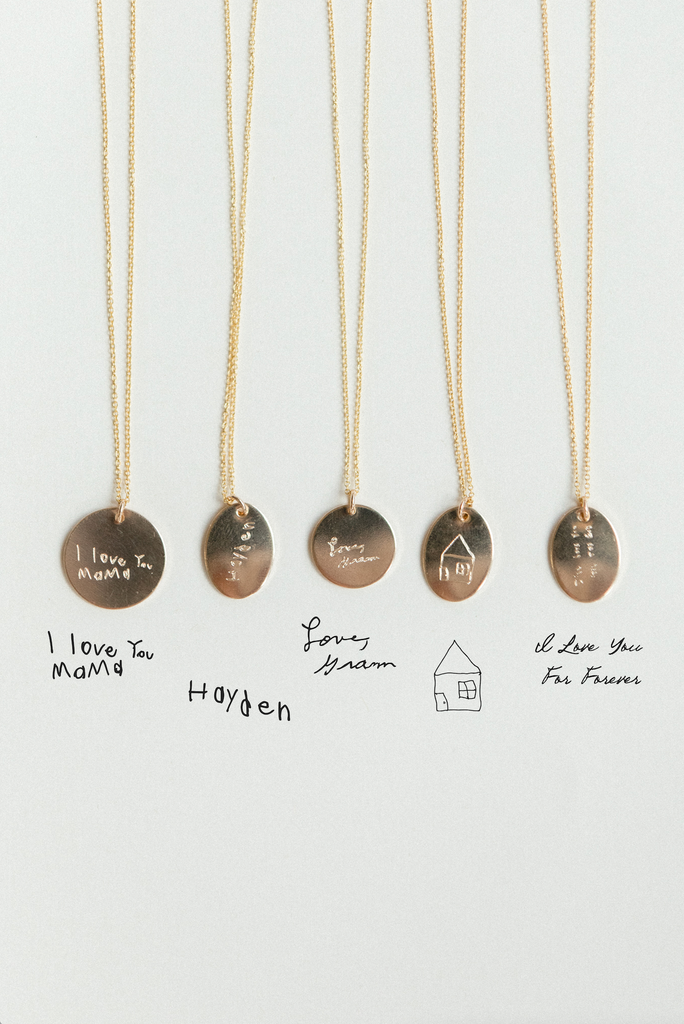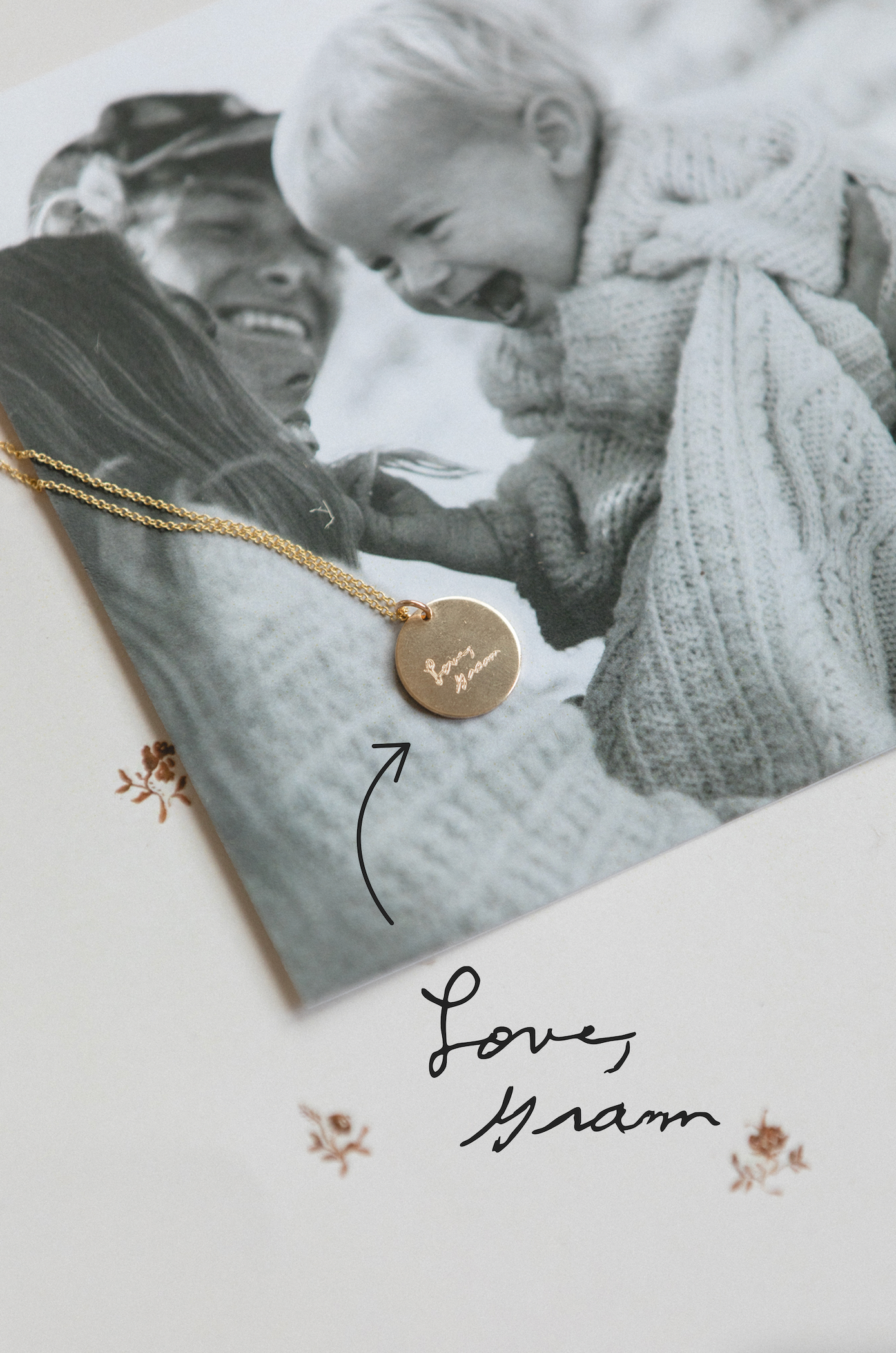 Capture a cherished message in a timeless piece with the Engraved Handwriting Disc Necklace. Expertly crafted to preserve the unique script of you or a loved one, this elegant pendant transforms a heartfelt note into wearable art. Its refined design complements any style, making it a sophisticated keepsake that celebrates personal connection and lasting sentiment.