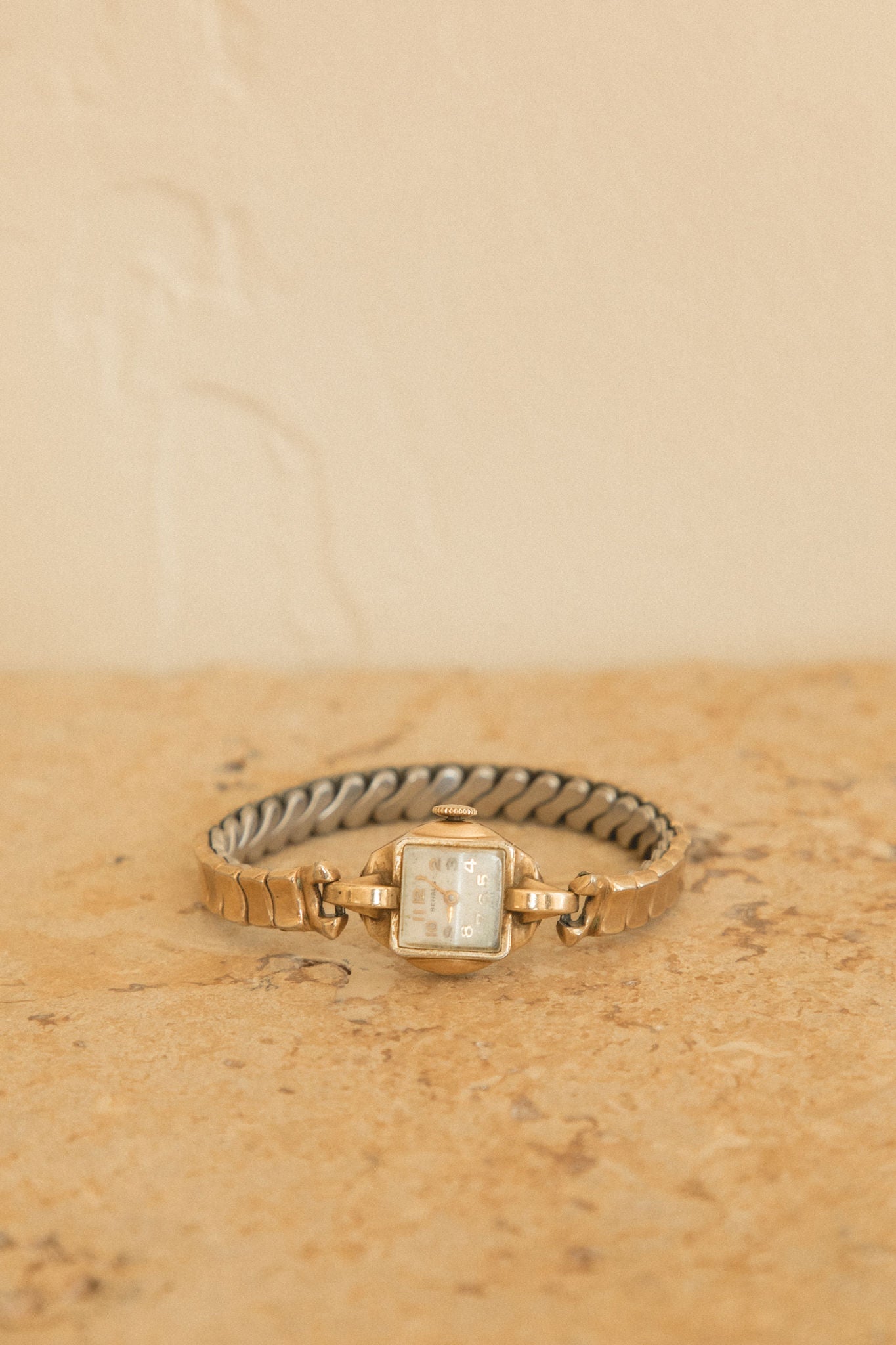 Vintage Gold Benrus. Minor wear on the glass. 6.25 inches in length. Ticking/working - mechanical. Adjustable Stretch band. 10 karat RGP bezel, 1/20 10 karat RGP band.