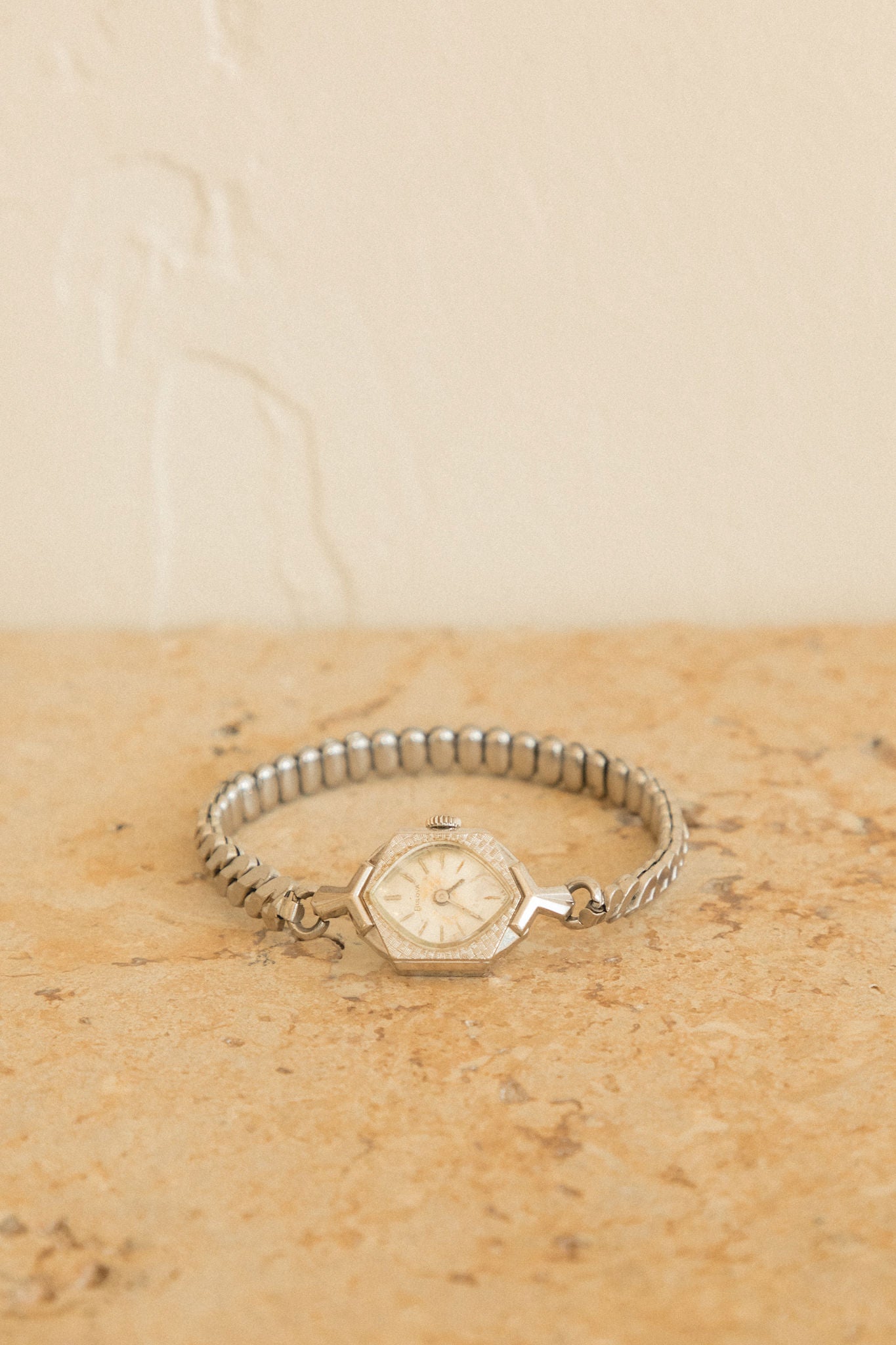 Vintage silver-tone watch with a petite geometric case, soft champagne dial, and comfortable stretch bracelet. 6.50-7 inches.