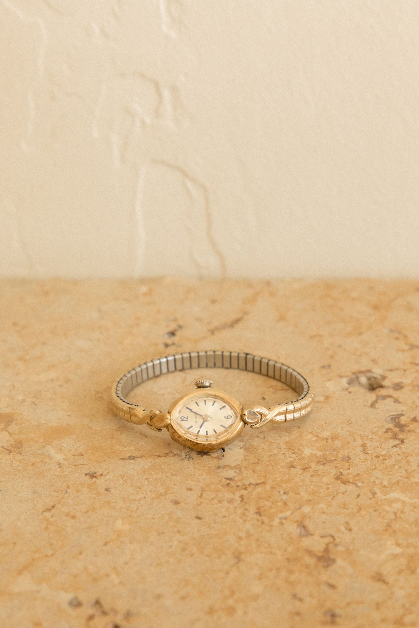 Vintage gold-tone watch with a petite round case, softly aged dial, and comfortable stretch bracelet. 6.75 - 7.25 inches. Mechanical.